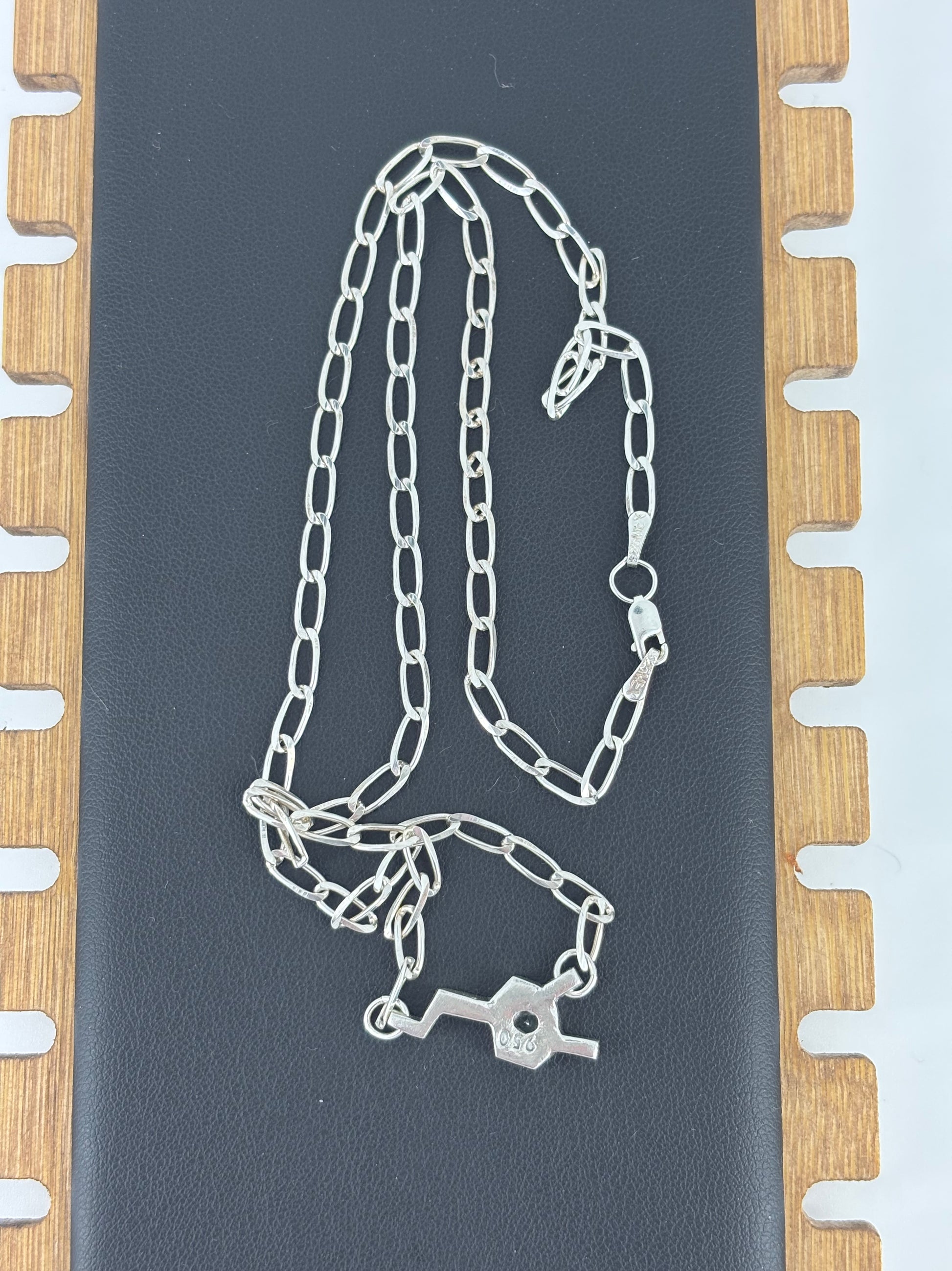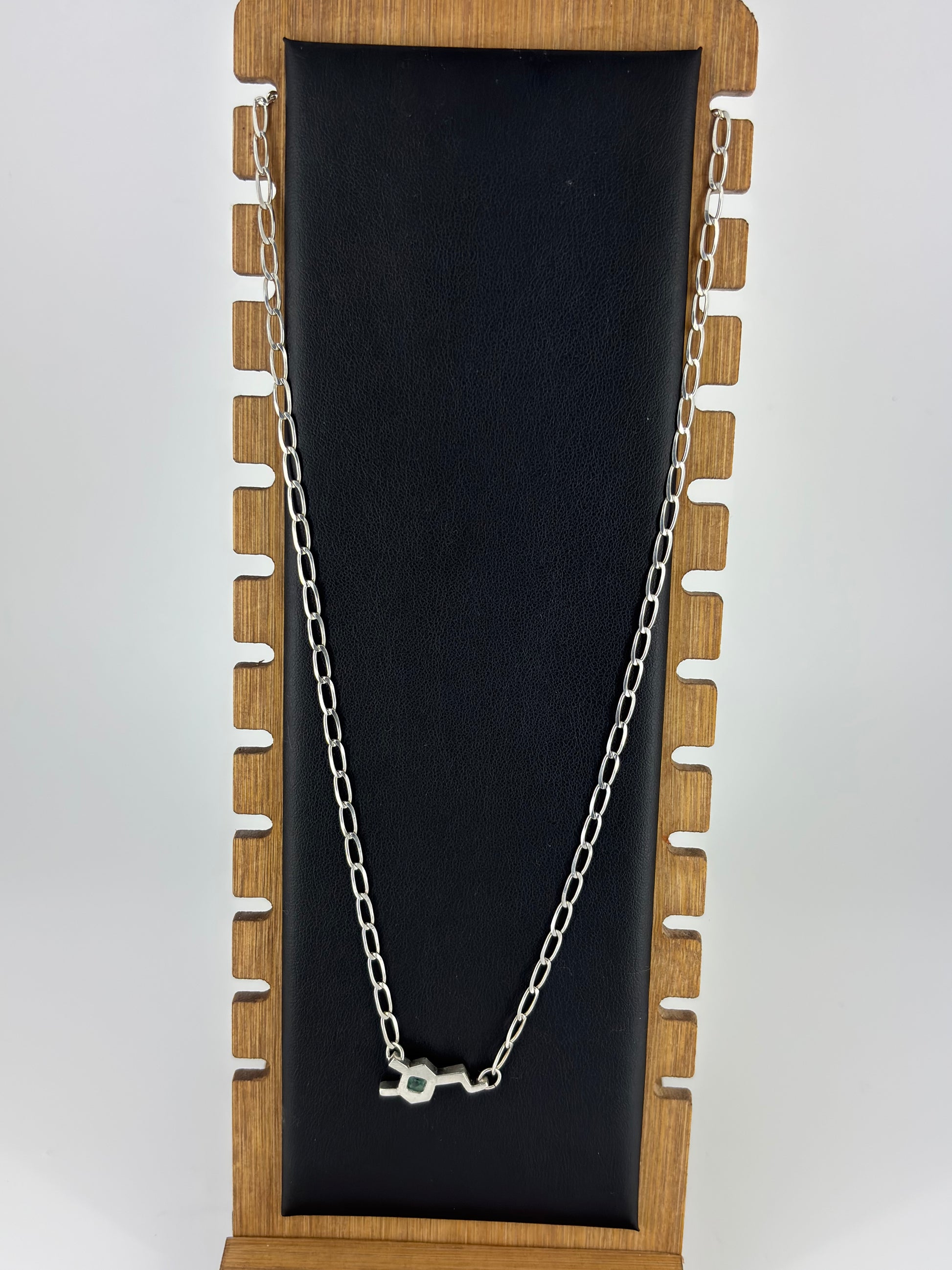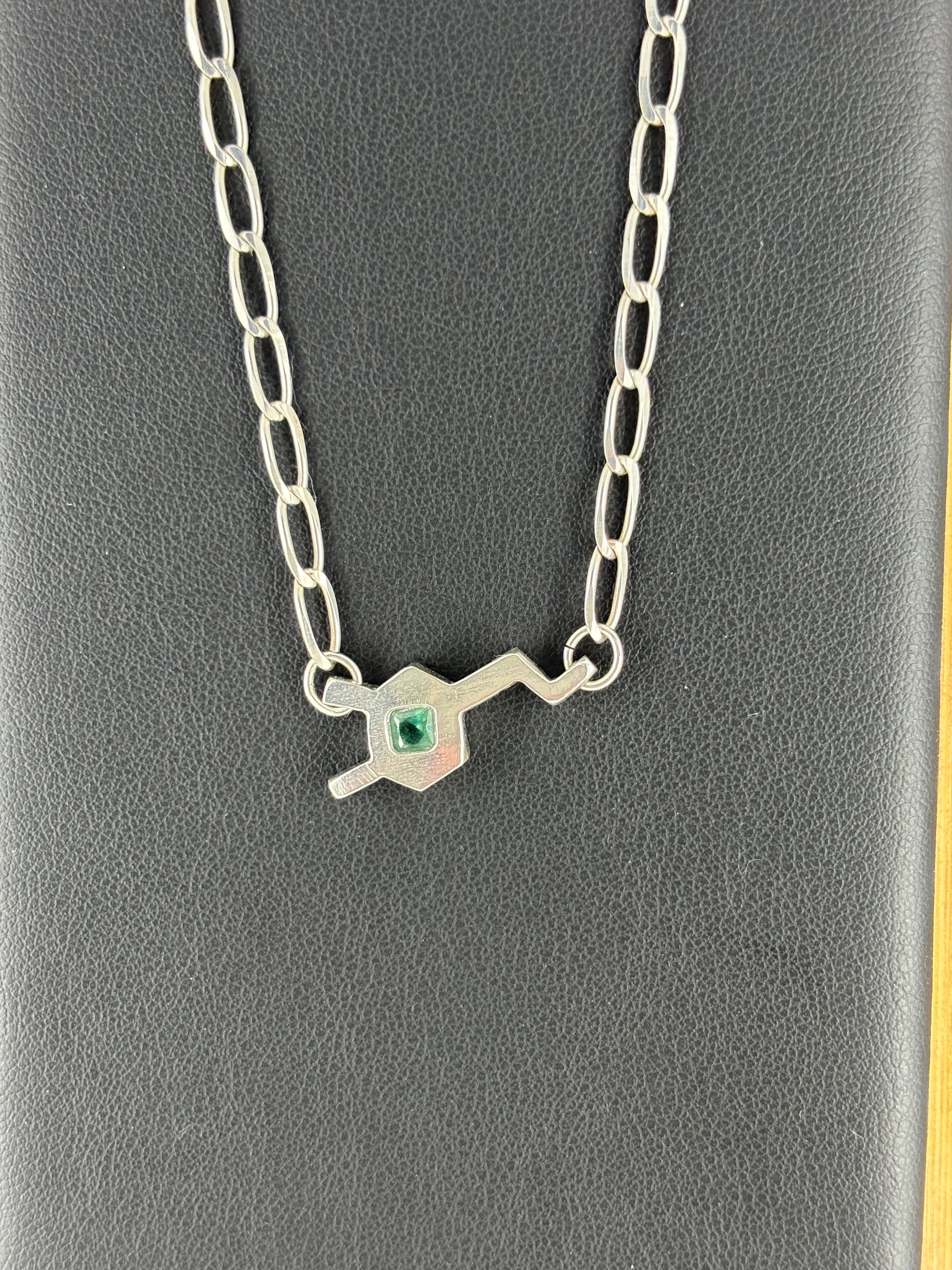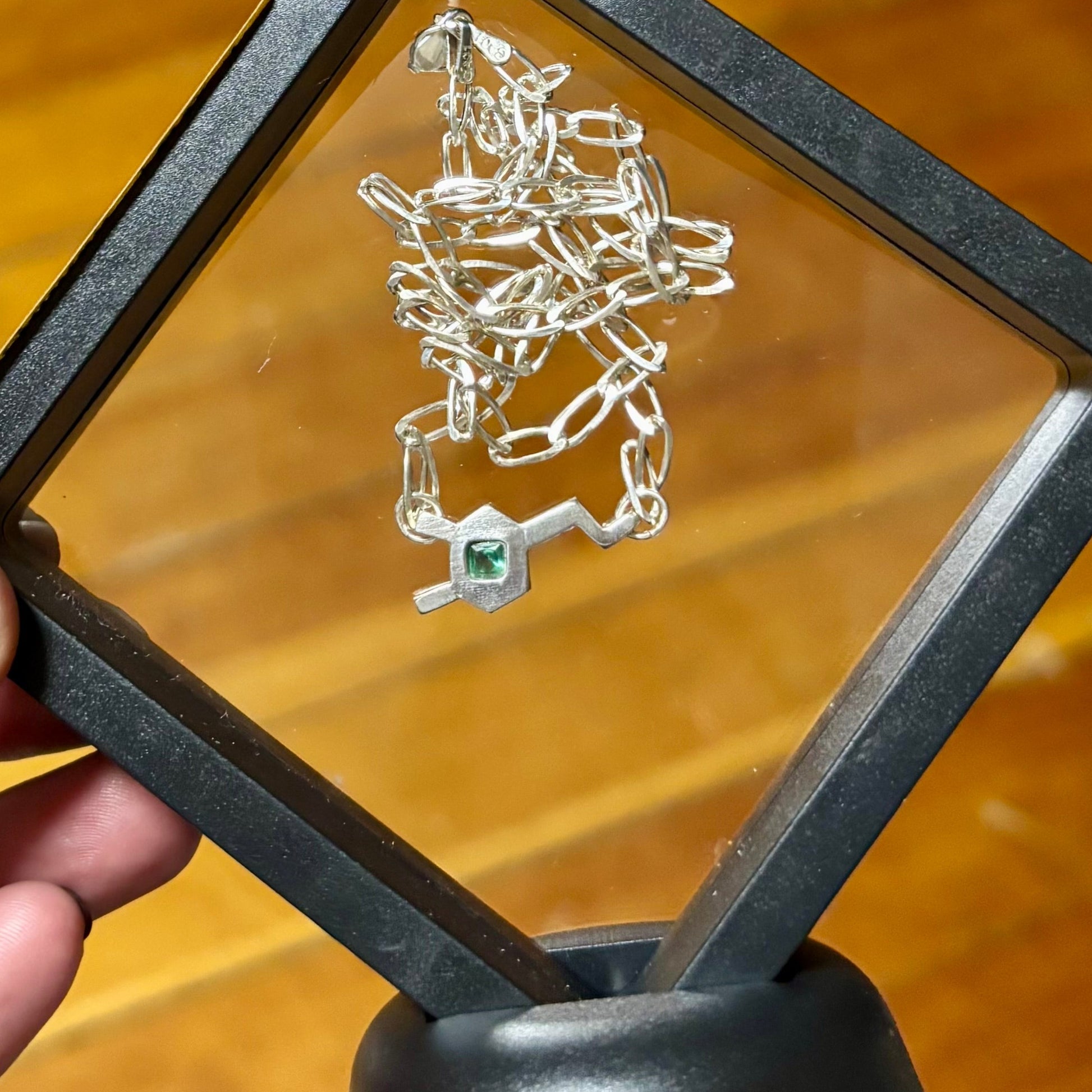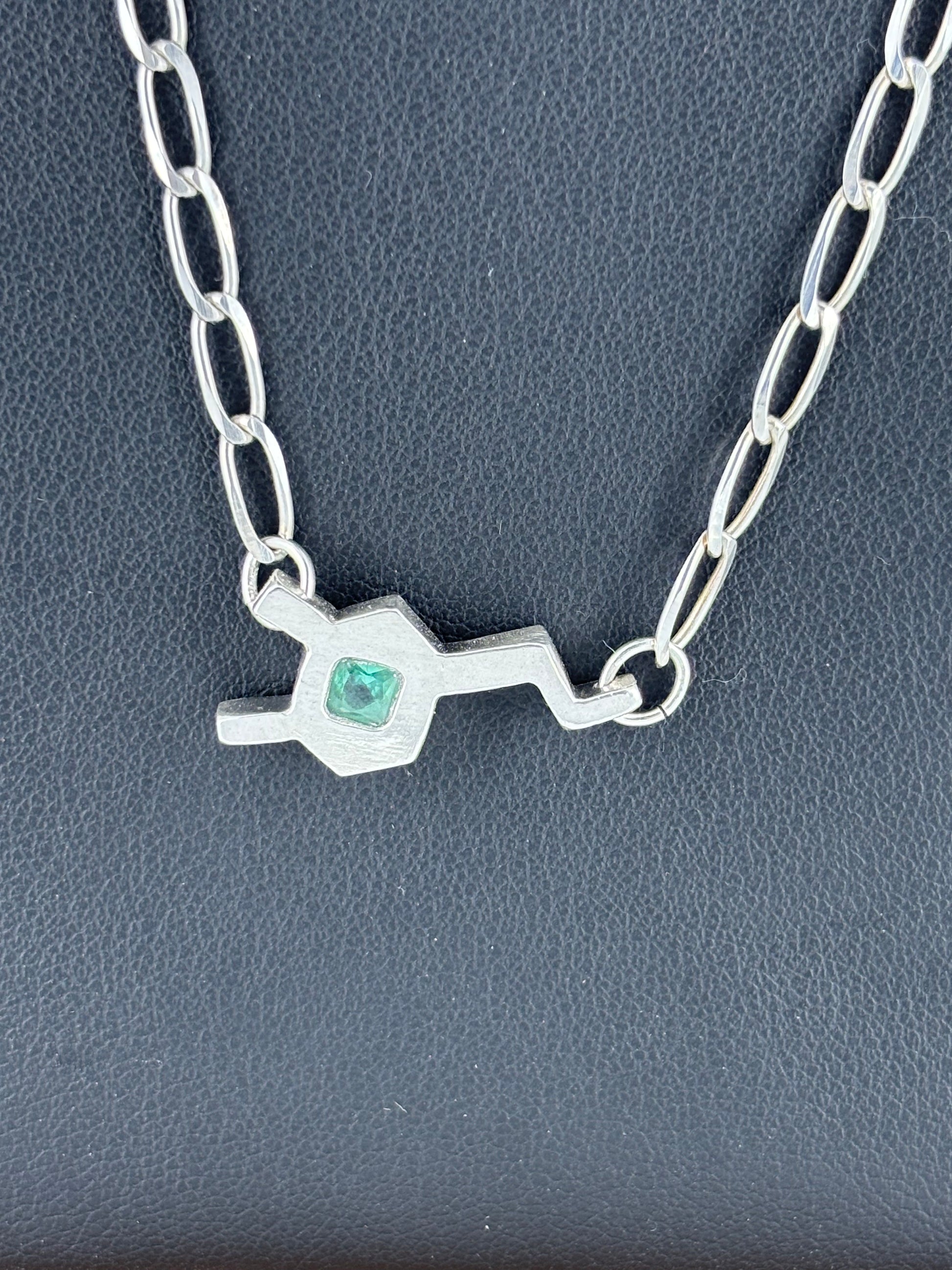 The pendant is a Dopamine Molecule in .950 Sterling Silver attached to a .925 Sterling Silver chain. The pendant is hand crafted. The chain is sourced from Taxco Mexico - Famous for its Silver! This Dopamine has a green gem in the center to represent Awareness and Support for anyone fighting through Mental Health Illnesses.